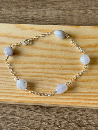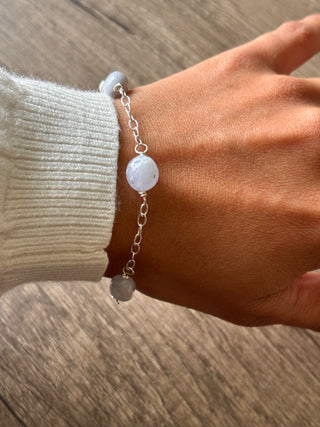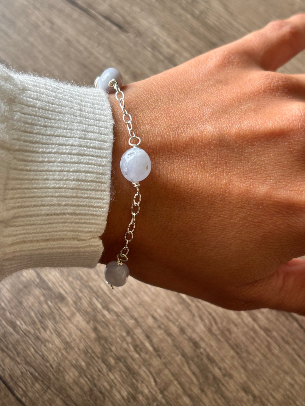 Elegant and calming, this Blue Lace Agate bracelet is crafted with genuine natural gemstones and set in high-quality Sterling Silver 925. The bracelet measures 21 cm in length and weighs 5.7 g, making it lightweight and comfortable for daily wear. Known for its soothing blue tones and gentle energy, Blue Lace Agate is often associated with peace, communication, and stress relief.