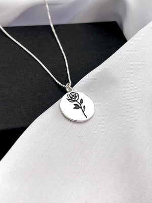 Delicate and striking, this Sterling Silver Rose Necklace features a beautifully detailed black rose pendant in a polished 14 mm circular frame. The design captures a perfect balance of elegance and edge, making it an ideal piece for both everyday wear and special occasions.