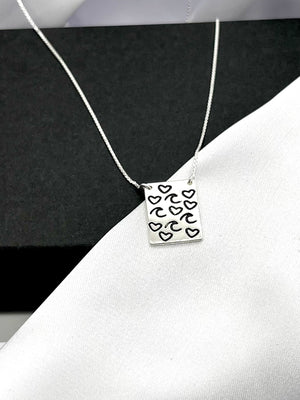 Crafted from premium 925 Sterling Silver, this elegant rectangular pendant showcases a charming pattern of engraved hearts and waves, symbolising love and fluidity. A subtle yet meaningful piece, perfect for everyday wear or as a thoughtful gift.